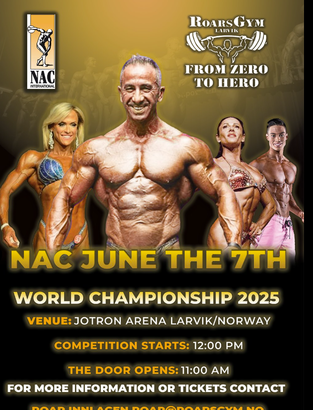 NAC International sitt Verdensmesterskap i bodybuilding og fitness nærmer seg, og det er duket for en spektakulær feiring av styrke, fysikk og dedikasjon. Her samles topputøvere fra hele verden for å konkurrere i ulike klasser og vise frem imponerende resultater av målrettet trening og livsstil.